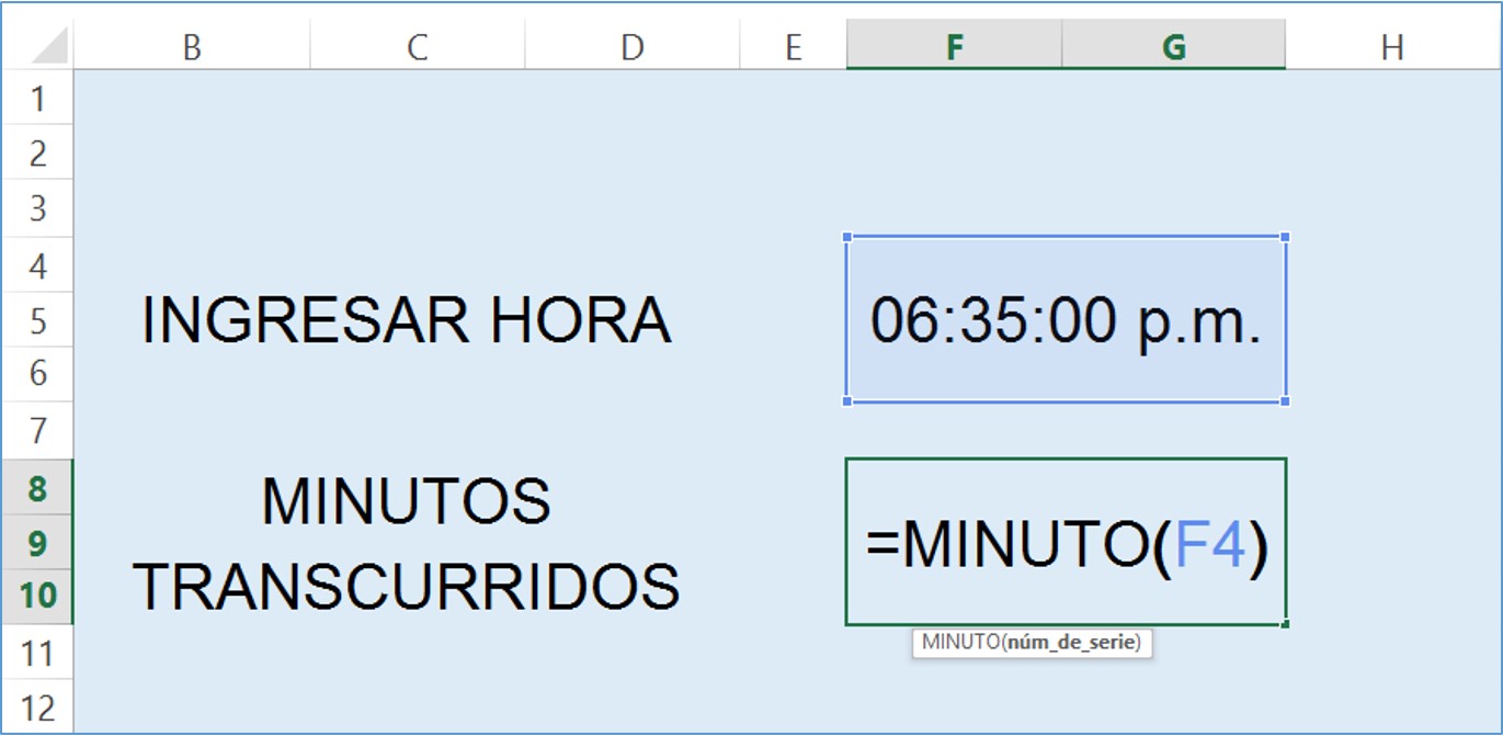 2) Debe escribir en la celda F8 lo siguiente: =MINUTO(