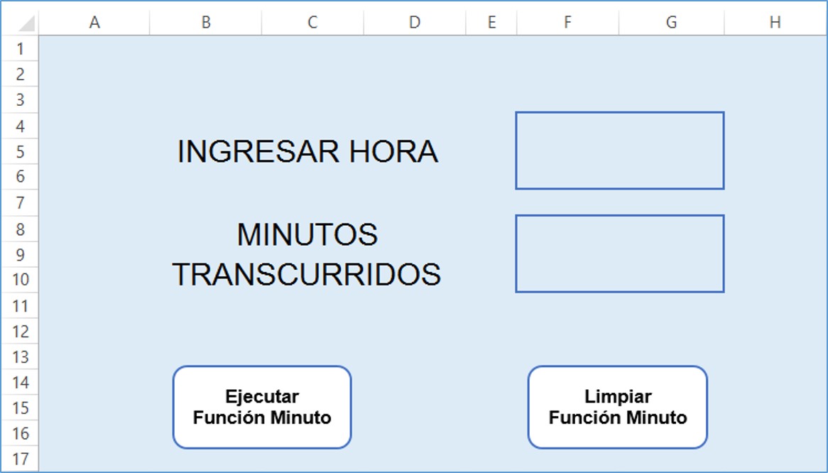 La pantalla mostrada cuenta con dos botones: El botón Ejecutar Función Minuto y Limpiar Función Minuto. En ese sentido, la macro que ha sido asignada a cada botón utiliza el siguiente código: