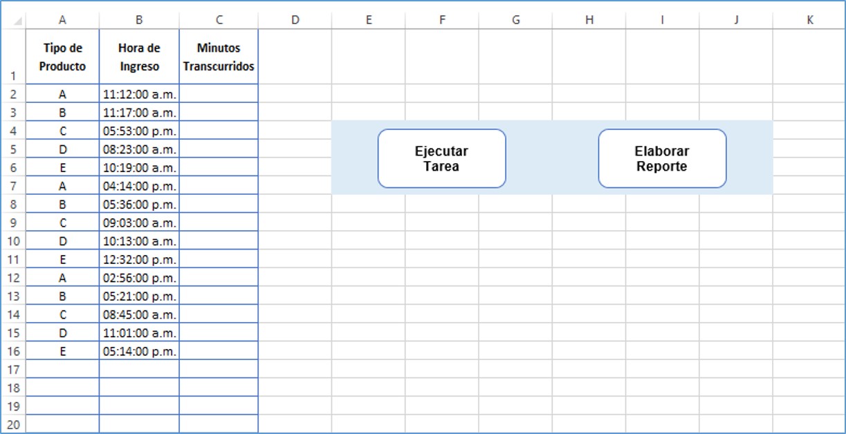 Una empresa de servicios recibe en su mesa de partes un expediente que puede corresponder al Producto A, B, C, D y/o E. El encargado registra la hora de ingreso en el formato mostrado y sólo debe llenar dos campos: El Tipo de Producto (Columna A) y la Hora de Ingreso (Columna B).