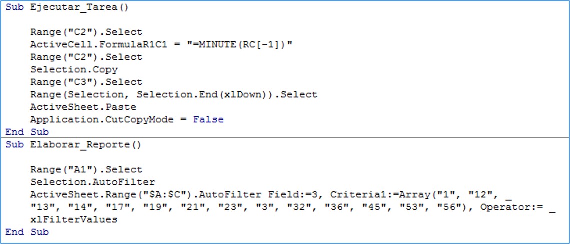 Al finalizar el día, el encargado debe presentar un reporte que extraiga los minutos transcurridos para el valor de hora ingresado por cada expediente. Dicha información será utilizada en otro proceso, pero es necesario que se encuentre automatizada. En ese sentido, la macro que ha sido asignada a cada botón utiliza el siguiente código: