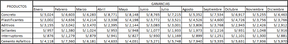 Para este ejemplo se utilizo datos de ganancias de manera mensual por tipo de productos. En la siguiente imagen se observará lo datos utilizados:
