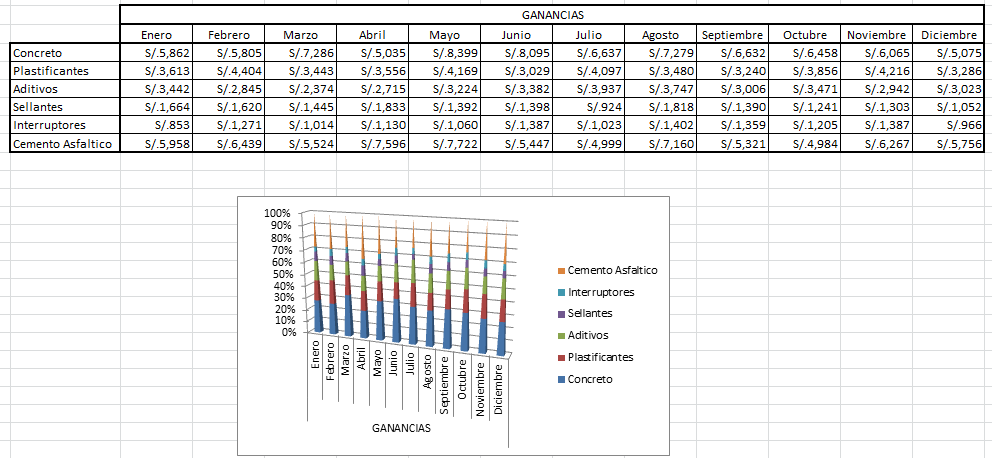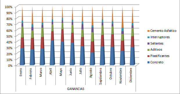 Podemos observar la valoración porcentual de cada producto por mes dependiendo del valor de las ganancias.
