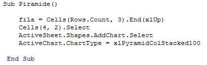 Inicialmente se aplico el grabador de macros para obtener el código del gráfico. Luego se elimino la fijación de la tabla y se coloco la variable  Row.Count para fijar la celda en uso y End(xlUp) para que se desplace hasta el final de la tabla tomando los valores hasta la última columna.